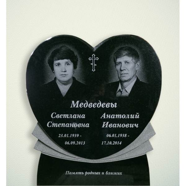 Двойной памятник "Сердце вертикальное" имеет сложную красивую форму. Может быть изготовлен в зеркальном отображении. Запилы при желании заказчика можно сделать чёрными, полированными за дополнительную плату.